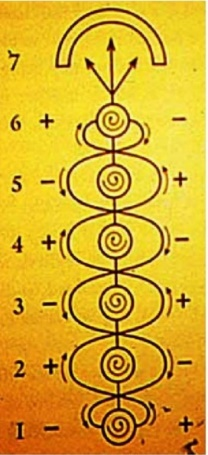 Ida et Pingala s’entrecroisent en différents points, centres énergétiques ou chakras en remontant du plancher pelvien jusqu’au crâne.