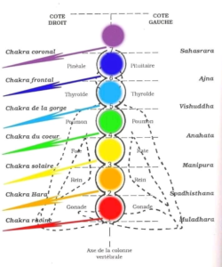 Parmi les principaux chakras, 7 sont situés le long de la colonne vertébrale. Chacun d’entre eux est relié à un corps subtil auquel il redistribue de l’énergie, à une glande endocrine et à des organes dont il a la charge et qu’il approvisionne également.